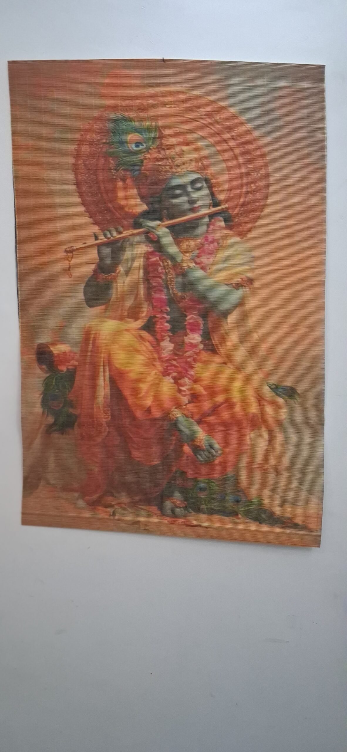 This wall hanging has been made by digitally printing on bamboo sticks. A beautiful Krishna design has been carefully selected to suit all kind of interiors. The painting is polished by PU coating to protect it from dust, water etc. You can get this framed from all sides or just the top and bottom.